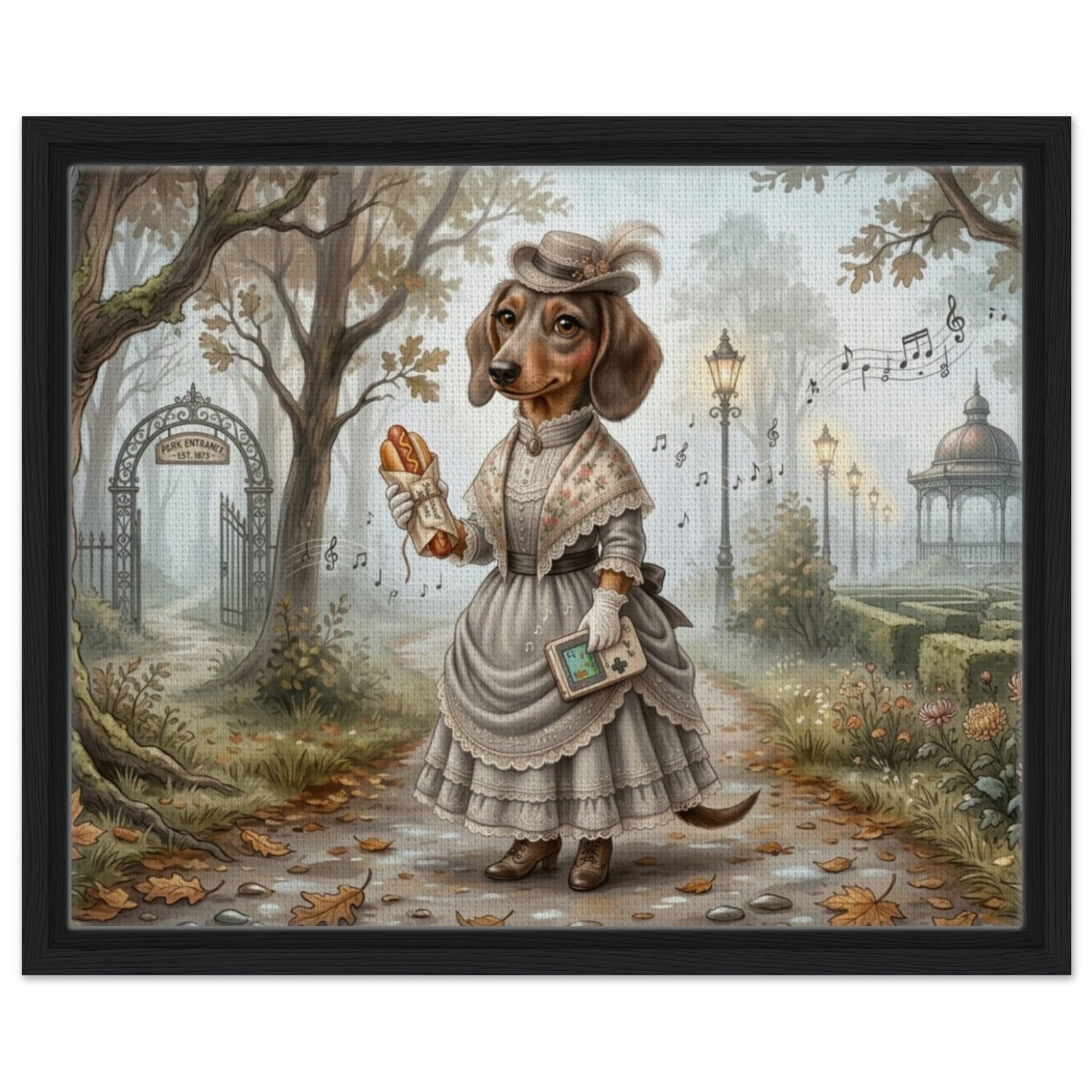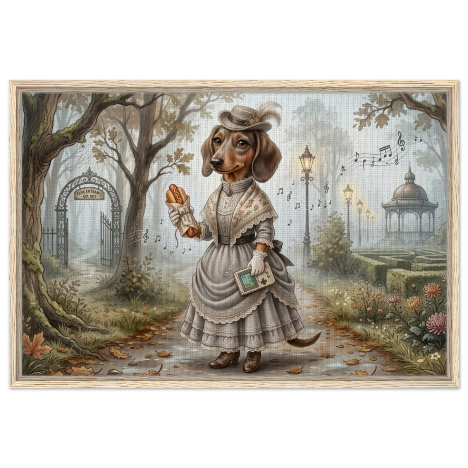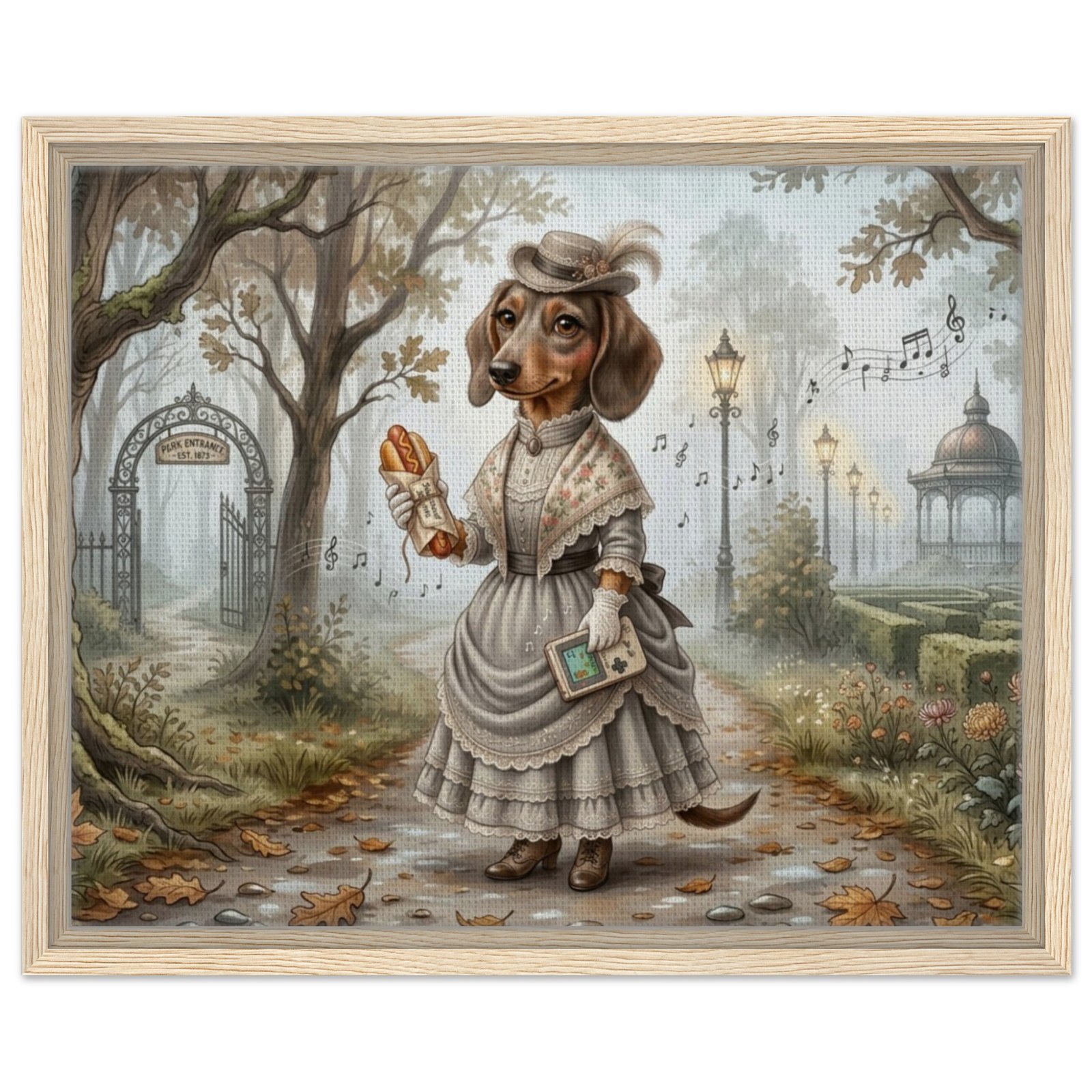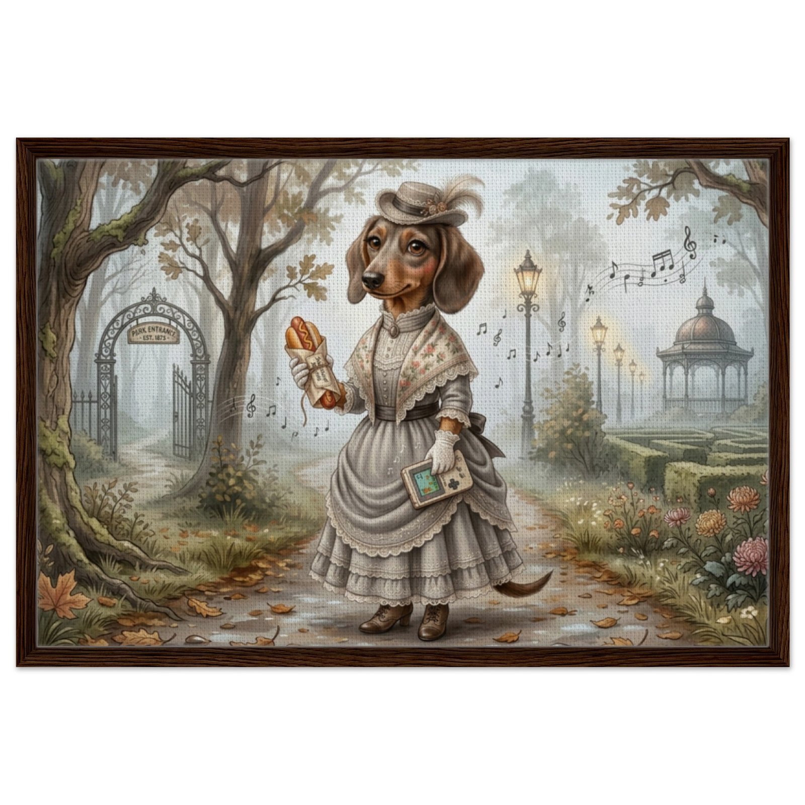 Step into a world of whimsy and wonder with this enchanting fantasy illustration featuring an anthropomorphic dachshund dressed in an elegant Victorian-era gown. Set in a misty, golden autumn park, this refined canine lady strolls a leaf-strewn path beneath majestic oak trees, holding a classic handheld game console and a wrapped hot dog — a delightful nod to modern gaming culture tucked into a timeless, storybook setting.