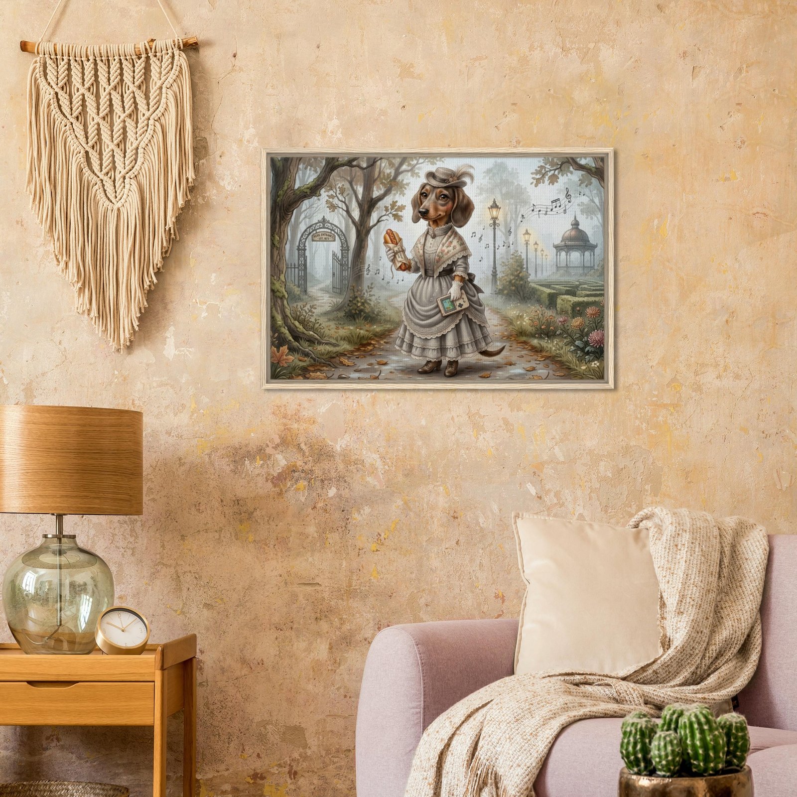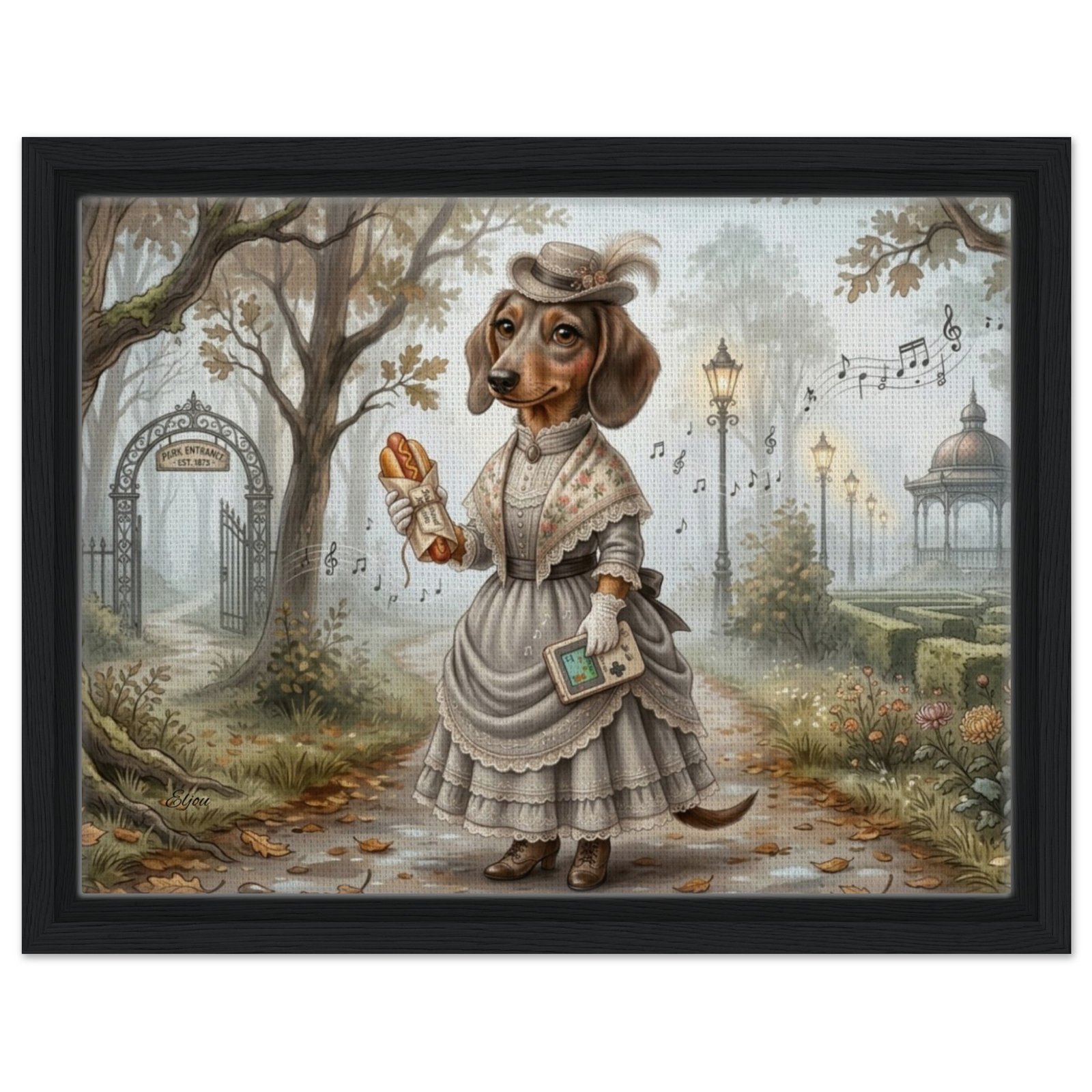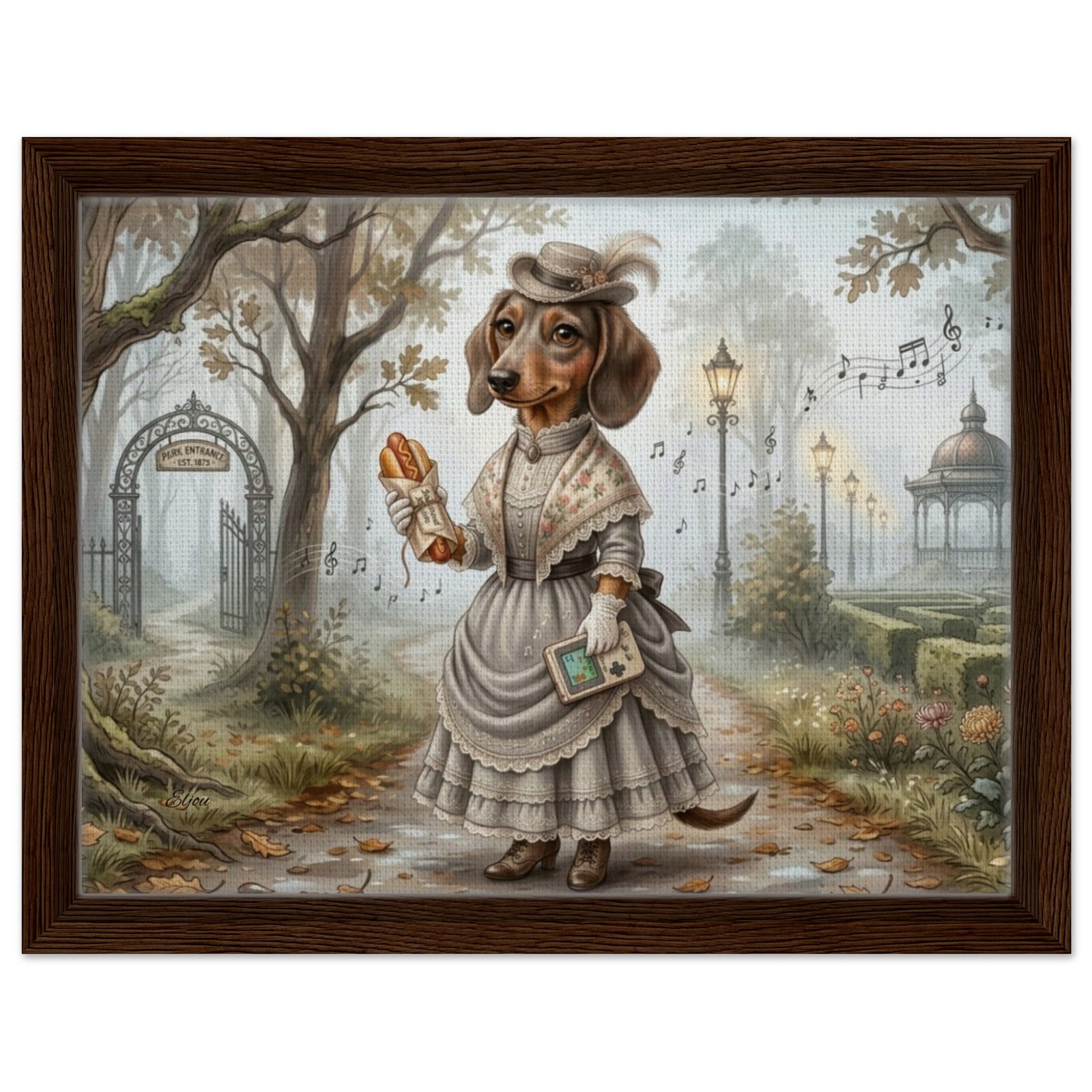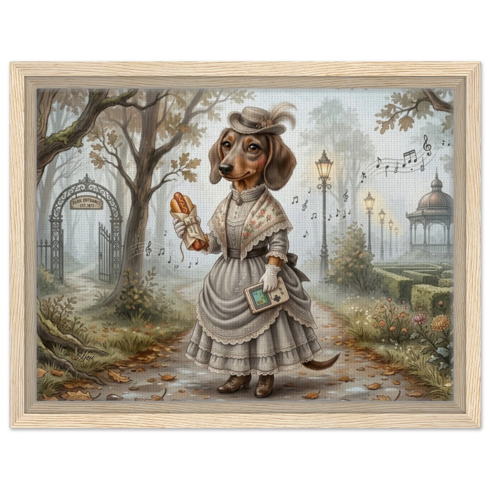 Step into a world of whimsy and wonder with this enchanting fantasy illustration featuring an anthropomorphic dachshund dressed in an elegant Victorian-era gown. Set in a misty, golden autumn park, this refined canine lady strolls a leaf-strewn path beneath majestic oak trees, holding a classic handheld game console and a wrapped hot dog — a delightful nod to modern gaming culture tucked into a timeless, storybook setting.