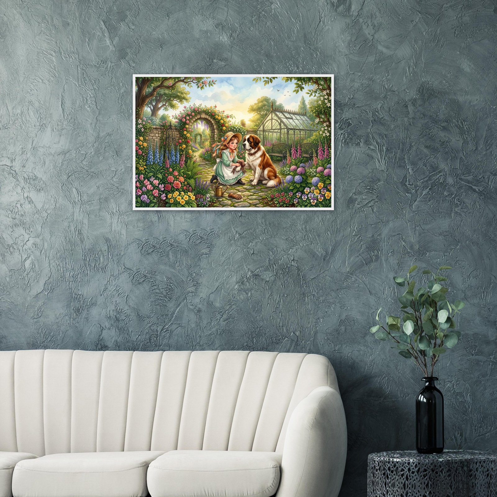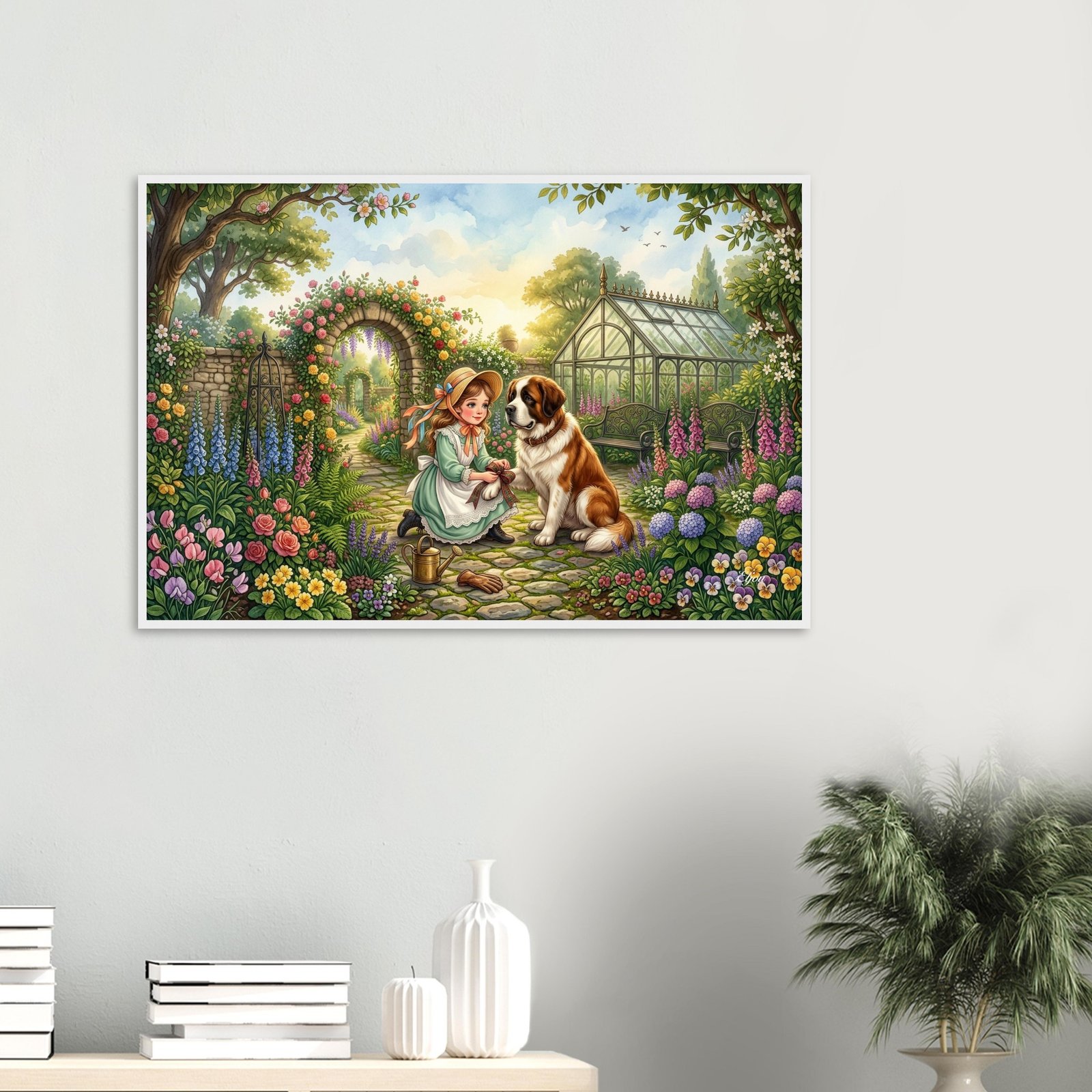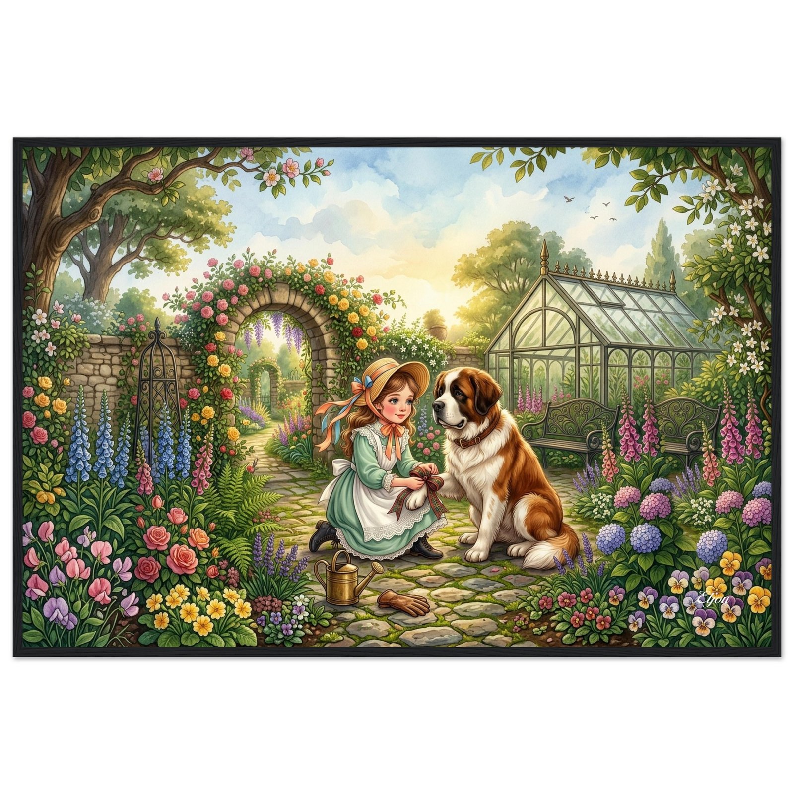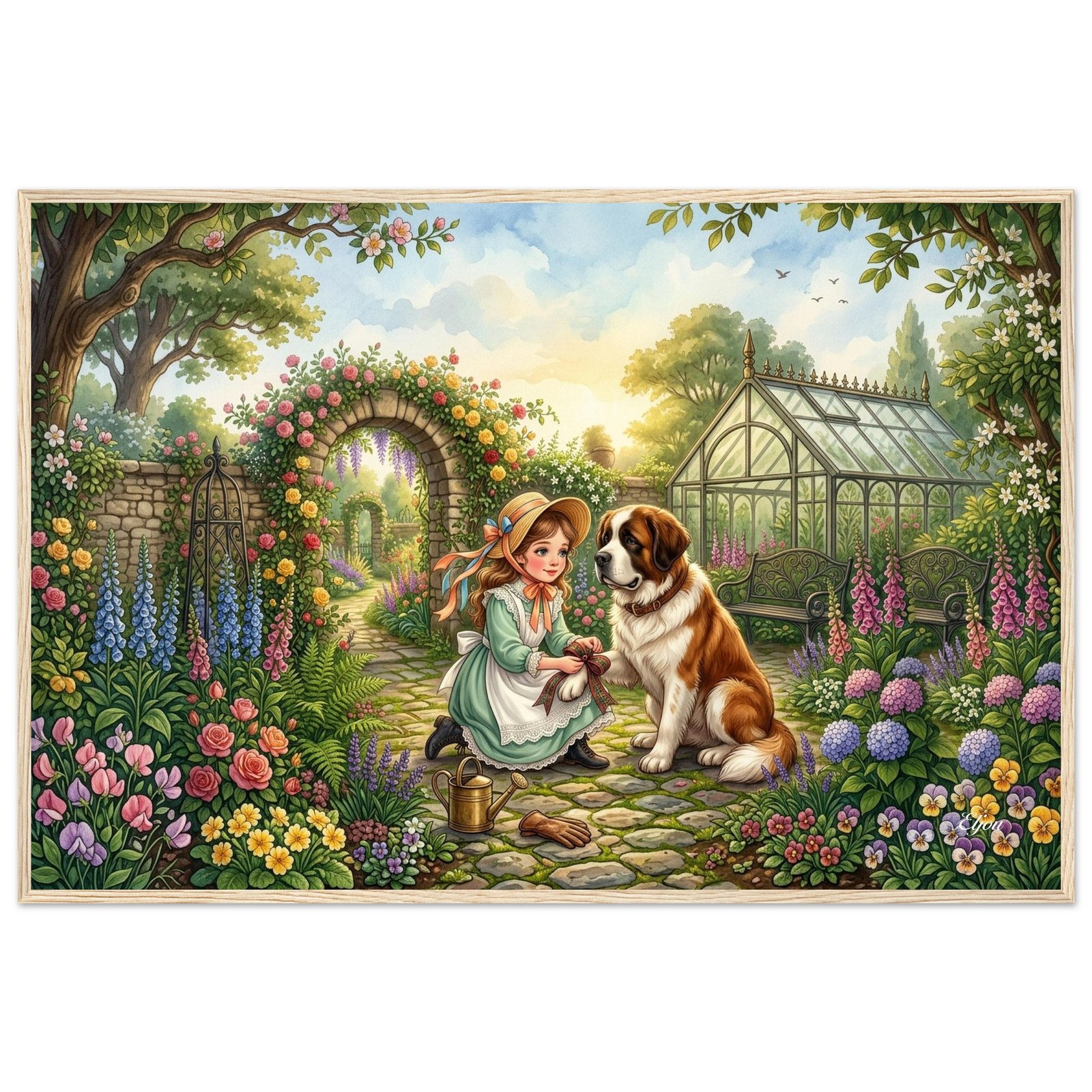A sweet and intimate illustration of a young girl in a sage green Victorian dress kneeling on a cobblestone garden path to carefully tie a tartan plaid ribbon around her Saint Bernard’s patient paw. Stone arches draped in wisteria and roses frame the scene, with a sunlit greenhouse and colorful blooms filling the background. A uniquely charming fine art poster for dog lovers, vintage style enthusiasts, and those who appreciate the quiet moments of friendship.