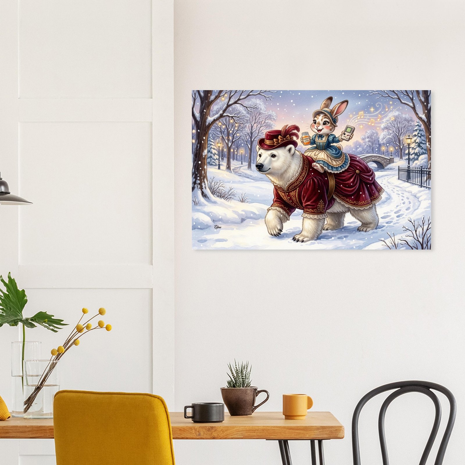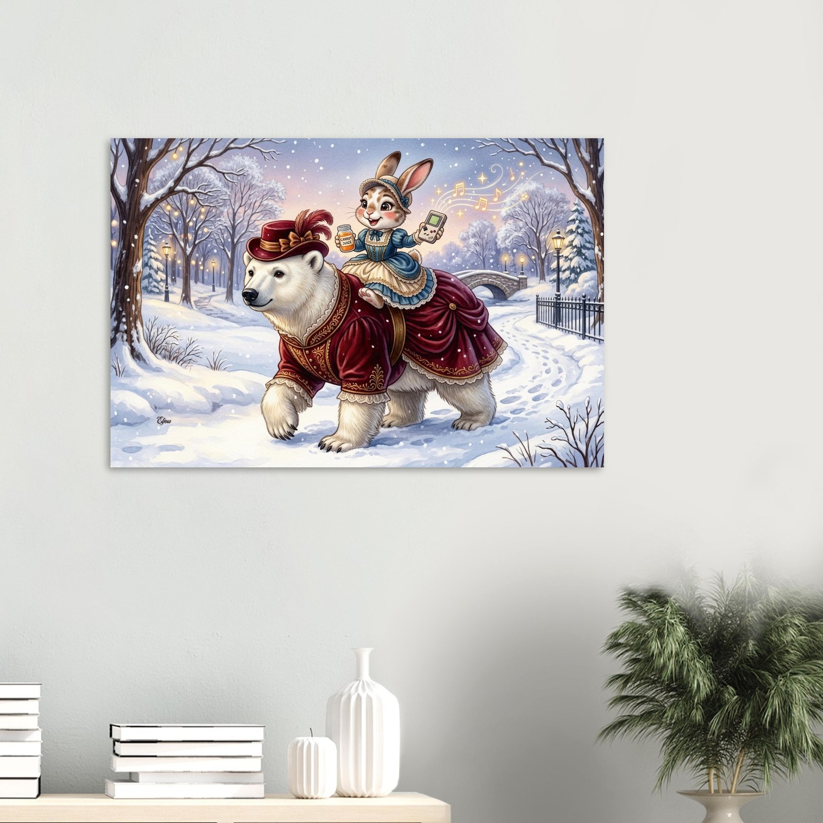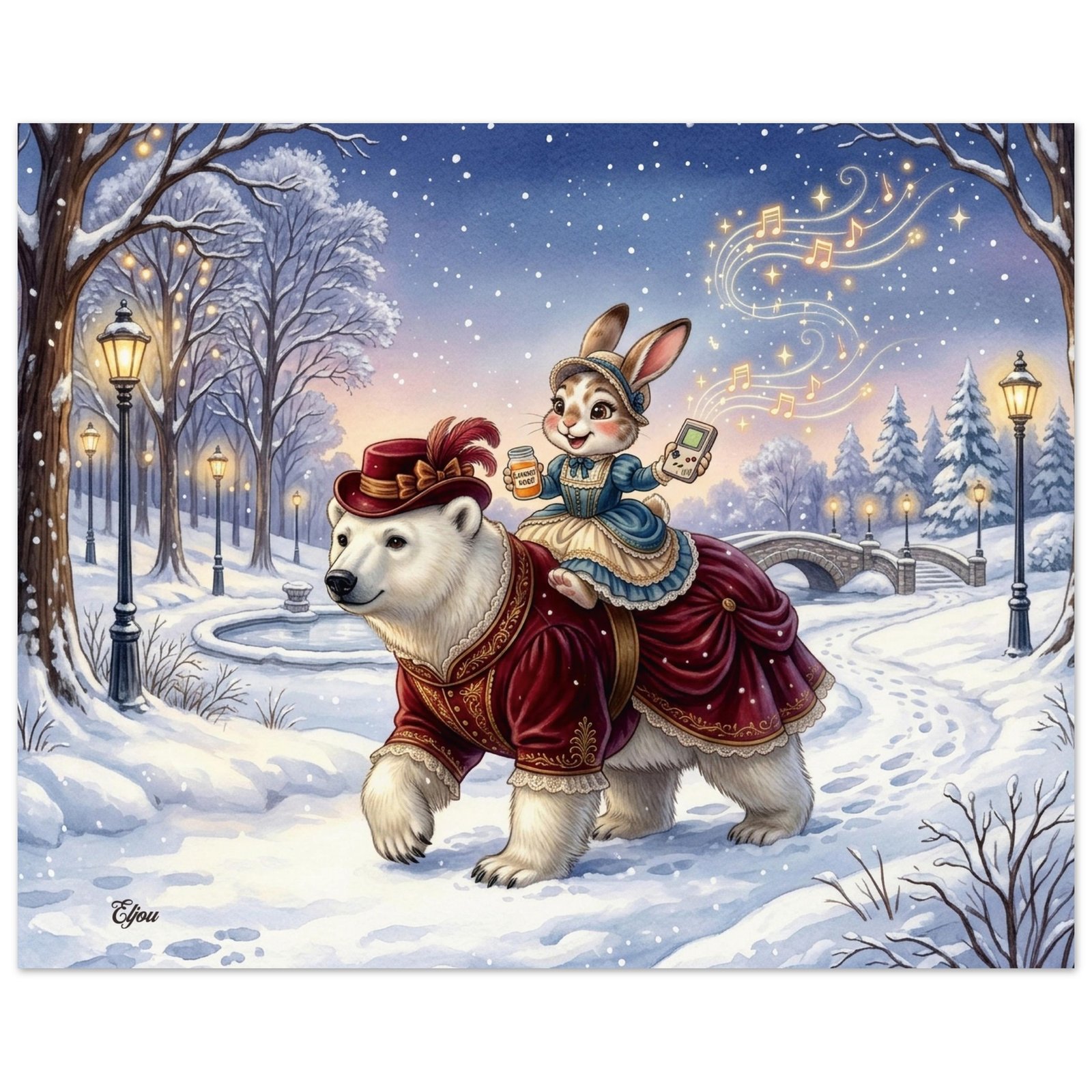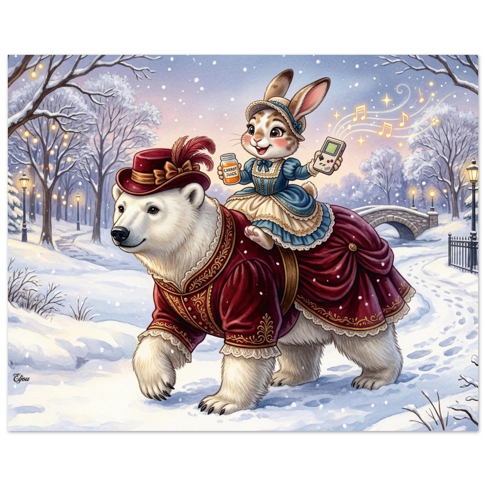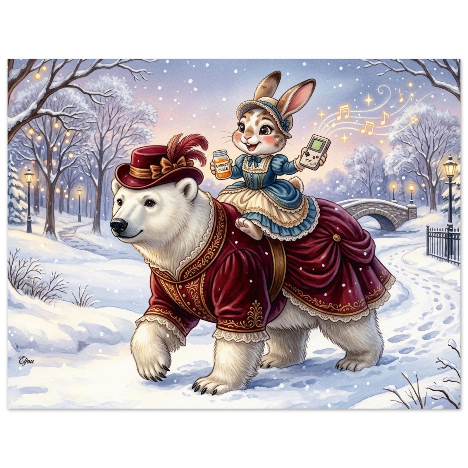 Venture into a magical winter wonderland with this breathtaking and utterly enchanting fantasy illustration featuring two elegantly dressed companions on a snowy evening stroll. A magnificent polar bear dressed in a luxurious dark crimson Victorian coat adorned with intricate gold embroidery and delicate lace trim strides confidently through a snow covered park, while her charming rabbit companion holds a retro handheld gaming console in one hand and a small container of carrot juice in the other — golden musical notes and glittering stars spiral magically into the breathtaking twilight sky above.